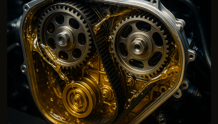 O sistema de correia dentada banhada a óleo consiste na instalação da correia de sincronismo, responsável por coordenar o movimento entre o virabrequim e o comando de válvulas, imersas no óleo lubrificante do motor. Essa configuração reduz o atrito entre as partes móveis, promovendo menos vibração e ruído durante o funcionamento.